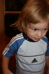 Det är kul att de stora märkena på träningskläder tillverkar så fina barnkläder. Här har Hampus på sig en t-shirt från Adidas. Inte helt lätt dock att fånga en sprallig liten kille som honom på bild. Med den energin och bollkontrollen tror jag på en lysande framtid inom någon bollsport.