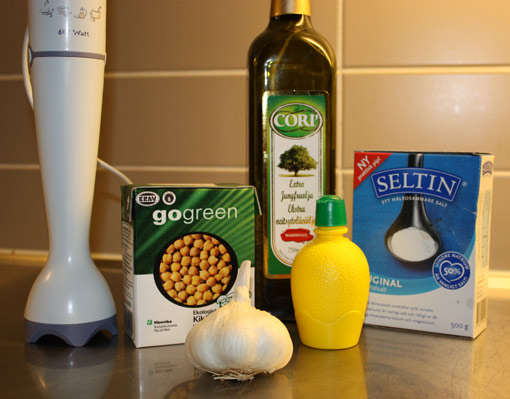 Riktigt gott är det med en hemmagjord hoummus (kikärtsröra) till kycklingen, på brödet eller hur man vill. Det går faktiskt väldigt fort att göra bara man har ingredienserna hemma. I mitt recept använder jag: