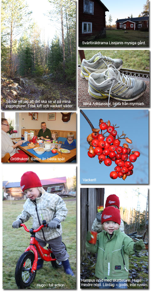Igår kväll flydde vi stan för att vila upp hos hos mina svärföräldrar i lilla byn Linghed i Dalarna. Det finns ingenstans jag sover så gott som här (och i Jämtlad hos mina föräldrar) och utvilad inledde jag lördagen med en skön joggingtur i skogen. Över moss och tuva sprang jag, helt utan att pressa mig utan jag bara njöt och kände mig stark. Som även Linda Fodor skriver i sin blogg, är det ibland skönt att träna utan att vara så prestationsinriktad. Hela vardagen handlar annars om att prestera (på jobbet, träningen, som mamma och fru). Därför att det skönt att komma till landet och bara slappna av.