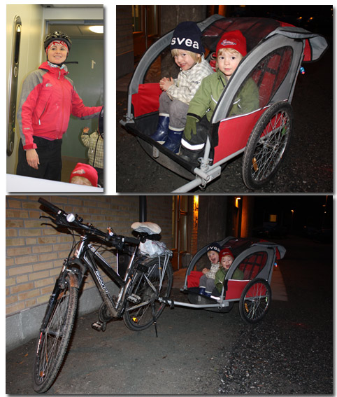En oerhört smart sak om man har fler än ett barn som ska transporteras till och från dagis är en cykelvagn. Det är väldigt tungt, men bra träning för ben och rumpan och går mycket snabbare än att gå. Min man är på Fitness Festivalen som startar idag, där han ska föreläsa, så jag får både lämna och hämta på dagis. Då parkerar jag vagnen där och cyklar sen vidare till gymmet och sen jobbet på min trogna Scottcykel – supersmidigt och roligt för barnen när det är gupp på vägen!