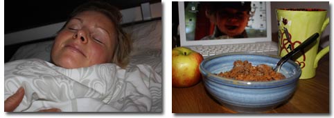 Idag tar jag vilodag från träningen. Det var ett tag sen och jag har så mycket att packa inför vår flytt nästa helg. Dessutom tror jag kroppen behöver det. Den jobbar hårt varje dag med att cykla ca 17 km varje dag (till och från jobbet), styrketräna och jobba. Så efter en skön sovmorgon till kl 8 blev det en lugn ”bloggfrukost”, gröt med proteinkräm (vanilj proteinpulver blandat med bara lite vatten till en tjock kräm), kanel, te och äpple.