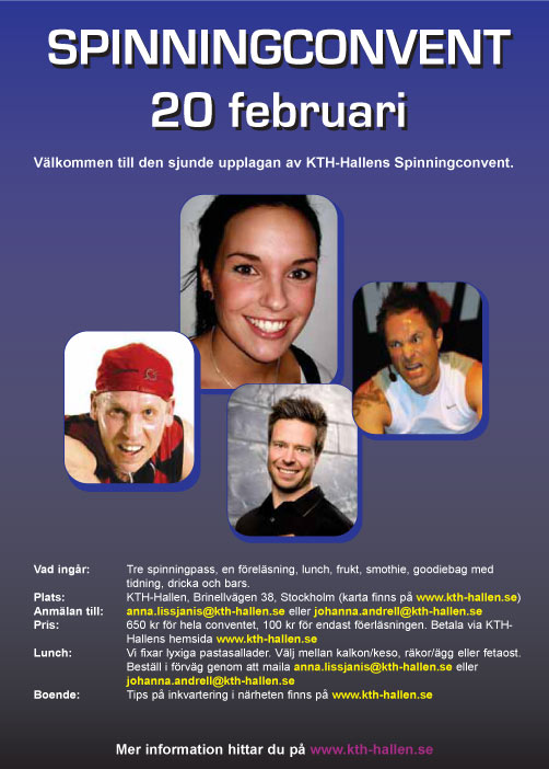 Du som gillar spinning får inte missa KTH-Hallens Spinningconvent i februari. Planera in i kalendern redan nu. Ett lagom stort convent där du får inspiration av ett gäng härliga instruktörer samt en intressant föreläsning.