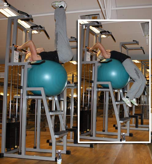 - Lägg dig med ryggen på bollen och ta tag i maskinen.