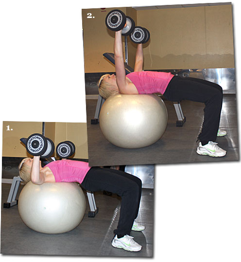 Vill du träna fler muskler än bröstet när du kör hantelpress ska du testa att göra den liggande på en boll. Genom att endast vila skuldran och huvudet på bollen och hålla upp höften får du bra träning för rumpan och bålen. Vill du öka svårighetsgraden ännu mer kan du prova att köra med en arm i taget. Då tvingas du jobba ännu mer med bålen för att hålla balansen.
