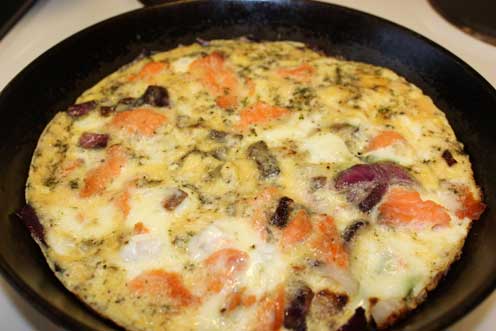 En sådan här smarrig laxomelett fixade jag till lunch idag, stekt i en riktig gjutjärnspanna som ger ifrån sig extra järn. I brist på matlåda finns det alltid lite smått och gott på mitt jobb eftersom vi även säljer lunchmat. Finns det bara ägg så kan man sen ha i vad man tycker om. Här har jag: