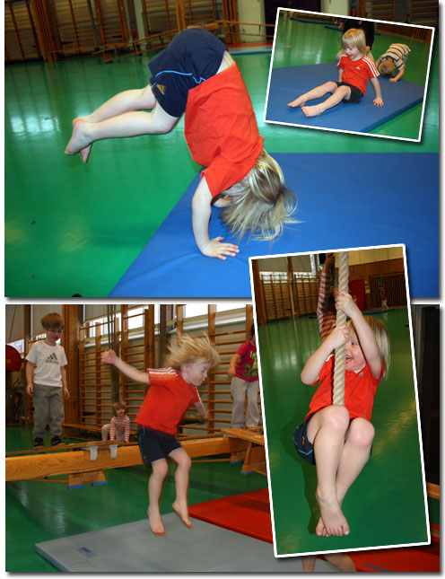 Min äldste son, 4,5 år, får nu gå på gympa på GIH med sin förskola. Hans ena fröken är utbildad gympa- och simlärare och nu har det kört igång med rolig träning för barnen. Jag var där och tittade stolt på hur min duktiga kille gick balansgång, hoppade, gjorde kullerbyttor och hängde i rep och ringar.