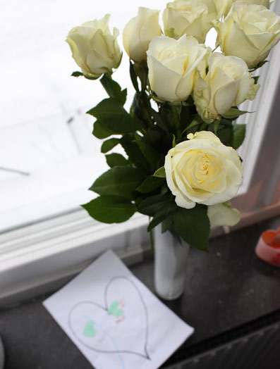 Jag fick dessa vackra rosor (eller vi fick dem för 1 kr på PrisXtra när man handlade för en viss summa) och Hampus hade ritat ett jättefint kort på förskolan.