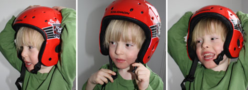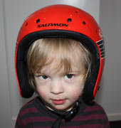 Så här snygg blev Hugo i sin nya Salomon-hjälm. Lillebror ville också prova, men har nu fått ta över brorsans gamla hjälm. Han var så stolt över att få vara med de stora barnen och åka pulka.