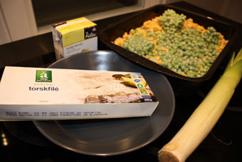 1. Lägg grönsakerna och fisken i en smord ugnsform. Salta och peppra fisken.