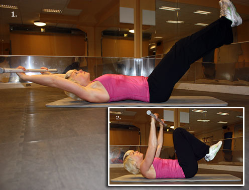 - Ligg på rygg med en viktplatta/medicinboll/viktstång ovanför huvudet i luften en bit ovanför golvet. Lyft samtidigt benen en bit ovanför golvet (ju närmare golvet du har benen ju tyngre blir övningen). Håll en stark mage och försök ha kvar hela ländryggen i mattan (något inte jag har på bilden).
