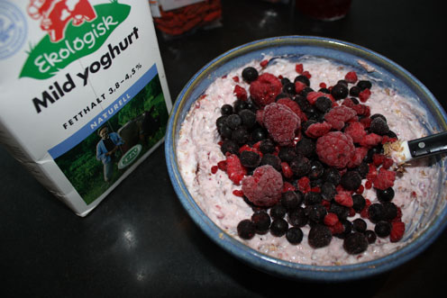 Jag jobbar kväll på fredagar och är inte hemma förrän vid kl 20.45. Tycker det är lite sent att äta riktig mat den tiden så det brukar bli något lättare (att äta framför favoritprogrammet Solsidan). Den här kesellamixen gör jag ofta då den innehåller mycket proteiner som tas upp långsamt av kroppen (perfekt före sänggående), ger gott om antioxidanter från bären och den är inte minst väldigt god: