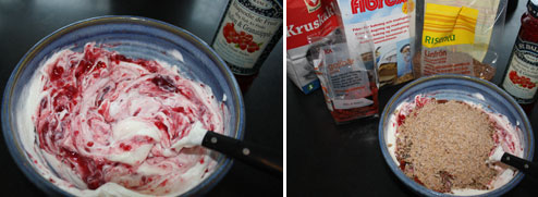 Oftast använder jag Öhnos lågkalorisylt, men just här använder jag en jättegod (& väldigt söt) sylt av märket St. Dalfour med smaken hallon/granatäpple.