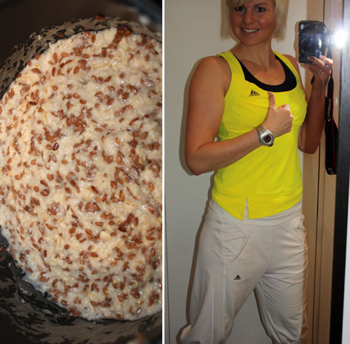 En stor portion havregrynsgröt med linfrön, päron och grönt te, kläder som passar för Afro och två fulla väskor med träningskläder, skor, vattenflaska, handduk mm är jag REDO! Vaknade redan kl 05.30 och kollade på klockan, ivrig inför dagens utmaningar.