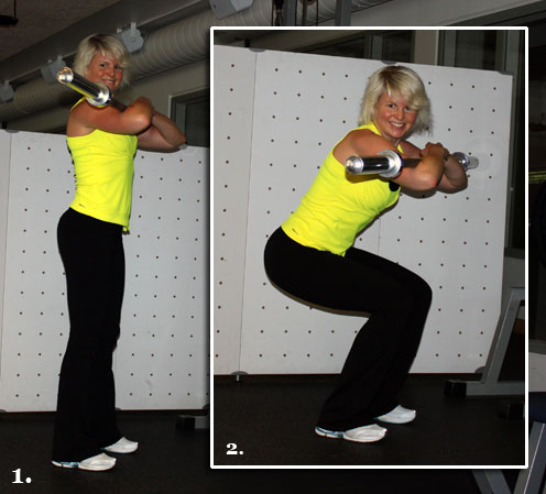 2. Böj i knäna så djupt du kan gå med rak rygg. Lite långsammare på vägen ner (räkna till 4) och vänd upp lite snabbare men fortfarande kontrollerat (räkna till 2).