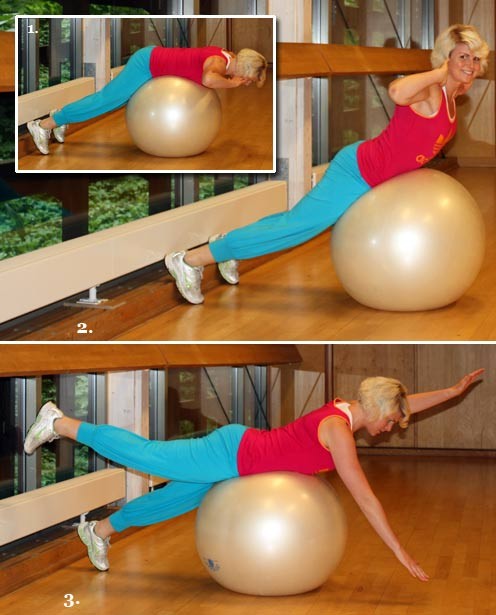 - En annan variant där du även tränar upp balans och koordination är att ligga på magen på bollen och göra diagonallyft av armar och ben. Här krävs extra koncentration.