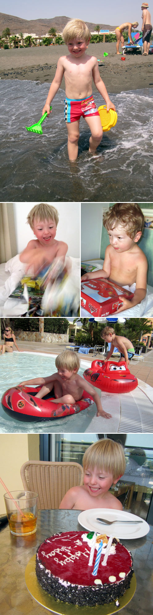 Här kommer lite bilder från Hugos 5-årsdag. Presenterna öppnades med stor iver (även lillebror fick några i förskott) och invigdes strax därefter i poolen. Vid vår lunchbreak på hotellrummet stod en tårta och väntade. Personalen på hotellet hade uppmärksammat Hugos födelsedag – supertrevligt!
