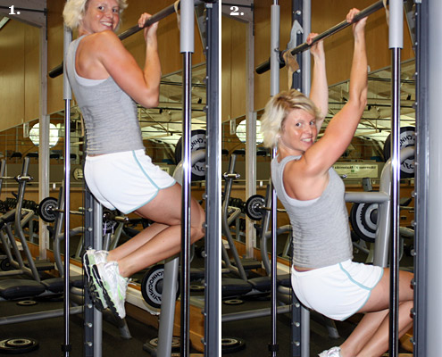 - Sänk dig långsamt och kontrollerat ner med stark rygg och biceps, alt. dra dig upp med samma muskler. I nedre läget – börja med att sänka skulderbladen och knipa åt musklerna runt skulderbladen innan du drar dig upp.