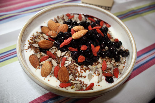 Så här på sommaren äter jag hellre kall mat till frukost än gröt. Lättkesella, naturell yoghurt, krossade linfrö, solrosfrö, gojibär, blåbär från skogen häromkring och mandel. Så gott att det skulle passa som efterrätt.