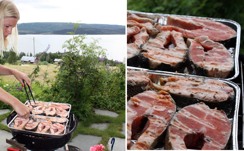 …och grilla! Syrran var kvällens grillmästare. Som en fortsättning på gårdagens inlägg om grillning. Idag grillade vi öring (ett f.d. 4 kgs monster till fisk) med romsås, sallad, ugnsrostade grönsaker och potatis. Mmmm.. 😉