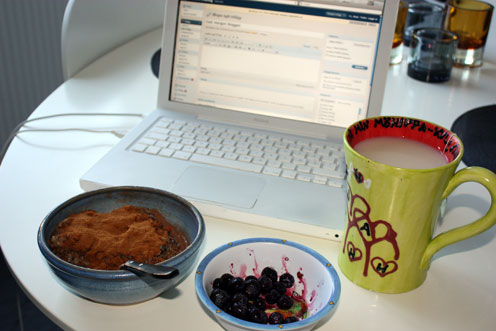 Men först frukost och skriva denna lilla hälsning till dig. Grötsäsongen är här och jag har gjort en specialare med havregryn, linfrön, psylliumfrön, gojibär. Till detta proteinkräm (chokladproteinpulver i en tjock smet – mmmm…), massor av kanel, blåbär och en STOR kopp vaniljte. Extremt nyttig nu, extremt onyttig i kväll = balans. 😉