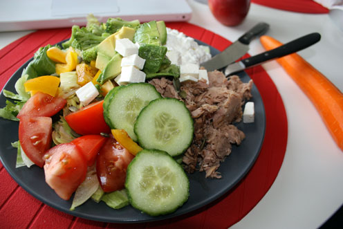 Idag är jag mer kräsen och äter inte direkt ur burken med lite äppelmos på (jo, jag har faktiskt gjort det). Nu vill jag ha massa gott till och kan skapa den mest delikata måltid av en burk tonfisk. Som dagens lunch, bestående av tonfisk, sallad, tomat, gurka, broccoli, paprika, vinegrette, keso, fetaost, avocado och pumpakärnor. Mmmm min älskade tonfisk! (eller är det tillbehören som är godast?)