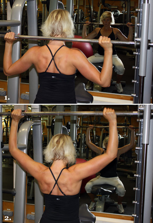 1. Håll stången bakom nacken med så brett grepp att armbågsleden är 90° när du pressar upp. Tänk att du skjuter fram armbågarna lite samtidigt som du jobbar uppåt.