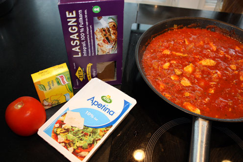 - Varva lasagneplattor och rikligt med kycklingsåsen och fetaostsåsen. Strö lite riven ost på toppen.