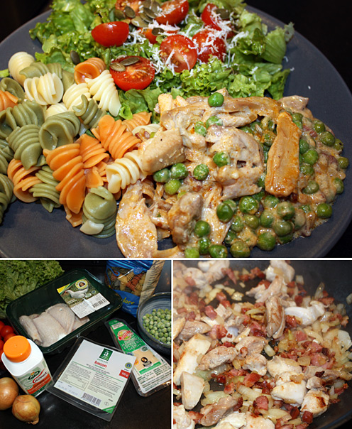 I dag blev det ”pasta med krämig sås på kyckling och bacon”. Då hela familjen gillar kyckling och pasta föll det alla på läppen, men till barnen hoppade jag över de gröna ärtorna. De fick morötter i stället (den enda grönsak Hampus äter). Receptet var lätt att följa, men tog mycket längre tid än vad det stod det skulle ta eftersom jag emellanåt fick duscha av barn, snyta barn, klia barn på ryggen, klä på barn och medla för att de inte skulle slå ihjäl varandra..