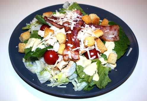 7. Knaperstek bacon och lägg på salladen, samt ringla över ceasardressingen och garnera med brödkrutonger.