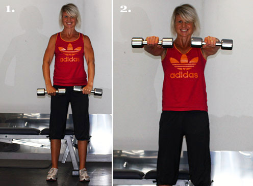 - Stå med raka armar och hantlarna en liten bit framför kroppen (de ska ej nudda kroppen). Spänn axlarna och bröstet.