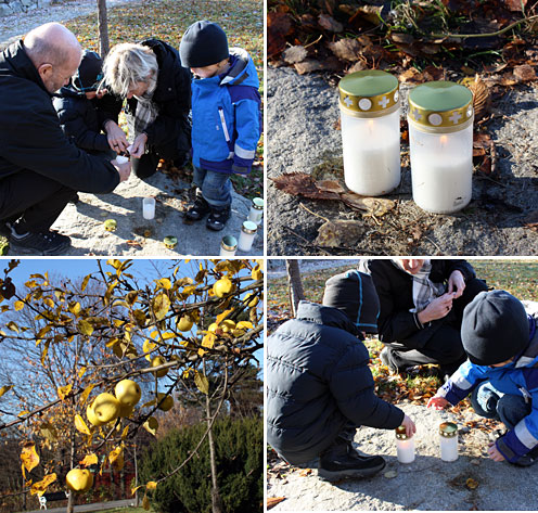 Varje Alla Helgonahelg åker vi till våra två änglars minneslund och tänder ljus. I dag var vi där mitt på dagen i det vackra solskenet. Barnen hjälpte till att tända ett varsitt ljus, ett till Jonna och ett till Hampus. Så fint, och jag blir helt lugn när jag kommer till barnlunden. Jag minns mina barn, jag sörjer, samtidigt som jag glädjs ännu mer över de fina barn vi har.