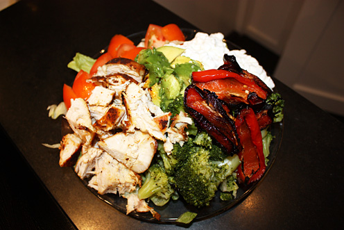 Själv vill jag dock äta gott även under diet, som på bilden ovan med massor av isbergsallad, tomat, keso, 1/2 avocado, pumpakärnor, ugnsgrillad kyckling och paprika. Kunglig dietmat.