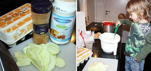 - Blanda ihop pannkakssmeten och häll över äppelskivorna.