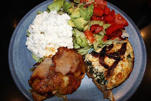 Kanske lite reklampåverkad? Hur som helst lyxade jag till kycklingen med ett snitt som jag fyllde med bitar av soltorkade tomater. När kycklingen nästan var klar i ugnen la jag på mozarella och tunna skivor av rökt kalkon. Till kycklingen min spenat- och fetaostpaj, sallad, keso och avocado. MYCKET gott om jag får säga det själv!
