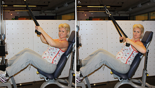 1. Sitt på en lutad bänk eller stå upp och ha ett rep kopplat överst i en dragmaskin.
