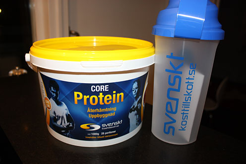 Jag har nu fått hem proteinpulvret från Svenskt Kosttillskott – Core Protein. Det innehåller 100% vassleprotein vilket är den enskilt bästa proteinkällan med högst biologiskt värde. Dessutom är vassle en restprodukt vid tillverkning av mjölkprodukter, d.v.s. inga konstigheter alls (bara tillsatt lite sötningsmedel, i min smak kakao och laktatenzym som gör magen glad).