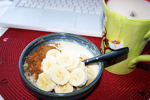 Idag när bedövningen släppt är jag inte lika kaxig. Varje steg är en pina och jag kan varken träna eller jobba, så här sitter jag med min gröt framför datorn med foten på en stol. Lyckades stolpa iväg med barnen till förskolan i mannens skor (får inte på mina egna) och ska nu vila för att orka ta mig till MVC på läkarkontroll. Måste dit för jag pallar inte att jobba heltid längre med den här magen.