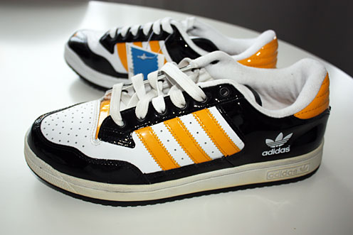 Mannens snygga gul/svarta Adidas-skor i blank retromodell han köpt i USA.
