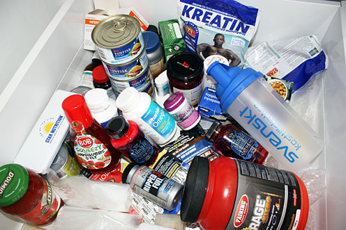 Vitaminer, mineraler, omega-3, mannens Pre Workout-grejer, tonfisk, jordgubbsylt...