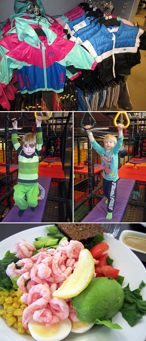 Startade med lite skön egentid på gymmets roddmaskin och sittcykel. Sen bar det av mot Andy´s lekland i Sickla. Ett litet stop i Adidas outletbutik lyckades vi få med barnen på, men köpte inget. Det snyggaste jag hittade var två söta barnjackor. Är helt bebis-hjärntvättad just nu.