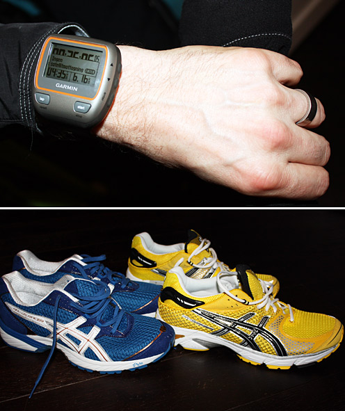 Inte nog med det har han fått sponsring av Asics och två par nya löparskor som står och glänser i garderoben. Ett par gula Asics Gel-Ds Trainer 16 och ett par blå Asics Gel-Ds Racer 8.