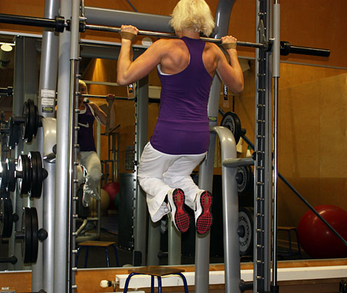 2. När du inte orkar dra upp dig mer, ta lite hjälp med ena foten på lådan för att komma upp med hakan över stången – känn hela tiden att du jobbar med ryggen.