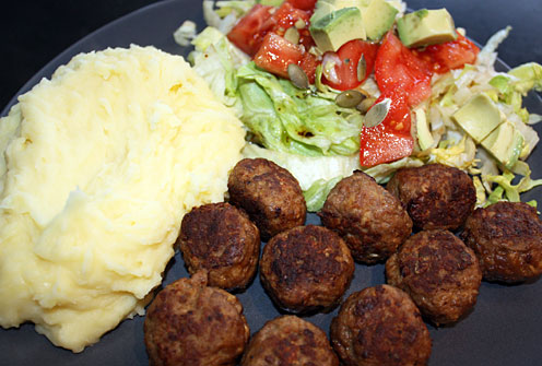Köttbullarna är gjorda av köttfärs från mina föräldrars kor i Jämtland (ekologiskt så in i bubblan), havregryn svällda i lite grädde och mjölk, två ägg och kryddor. Mosen av kokt pressad potatis vispad med varm mjölk, en klick smör, salt och vitpeppar. Inget konstigt alls! 🙂