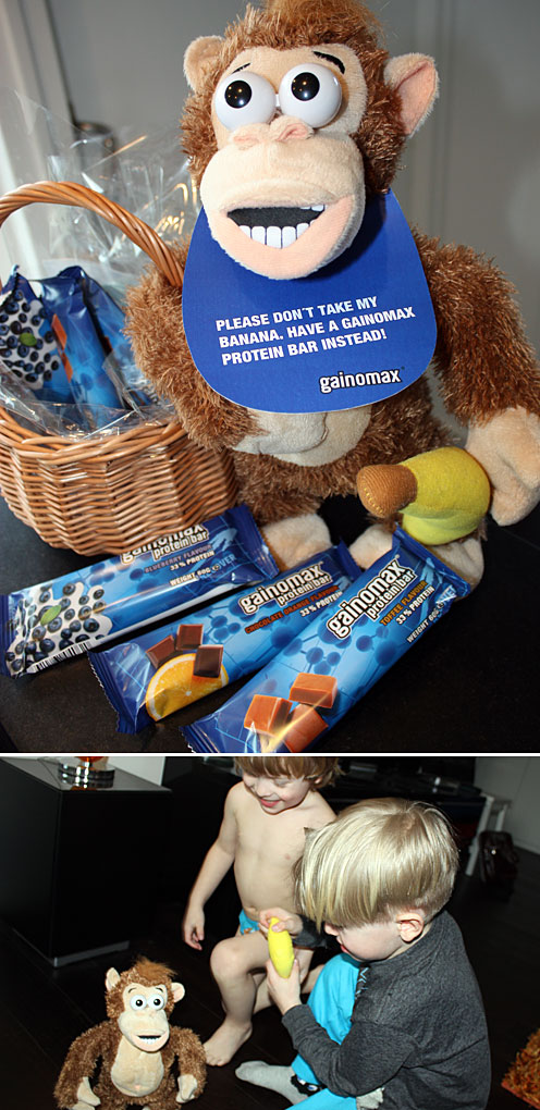 Vi fick en ny familjemedlem igår. Nej, ingen av tvillingarna har kikat ut, men lilla Gainomaxapan ”Nicke” (som barnen döpt honom till) kom med några Gainomaxbars i sin korg. Han höll på att skrämma vettet (det lilla jag har) ur mig när barnen tog bananen och han hoppade och skrek. De kunde ju inte läsa på lappen om hans hals.. Gainomax kan sin sak gällande marknadsföring! 🙂