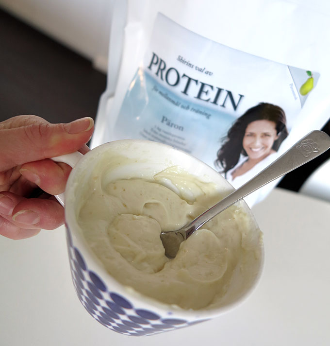 Idag var min första PT Hemma Hos-klient hemma hos mig för ett pass – superkul, och hon var så duktig! Efter det, och min egen tidigare träning, har jag nu ätit lillfrukost – en shot kallpressad linfröolja (hyffsat neutral smak, men nog att föredra i smothie) och snabba mellanmålet av Holistics nya proteinpulver med päronsmak, mixad med kesella och Gourmet-Pro Vanilla Cream. Skojar inte – det smakar verkligen Piggelin, eller kanske mer Päronsplitt med kesellan. Barnsligt gott!