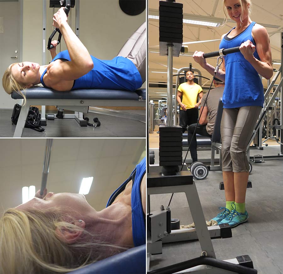 Dagens, och veckans syfte blir TUNG träning med 6-9 reps/set. Inte läge för superset eller att blanda in pulshöjare då, nej syftet är som sagt att lyfta tungt och då behövs lång skön vila mellan varje set. Passade mig bra att vila mycket på bänken en sjuka-barn-gör-mig-trött-dag som denna 🙂