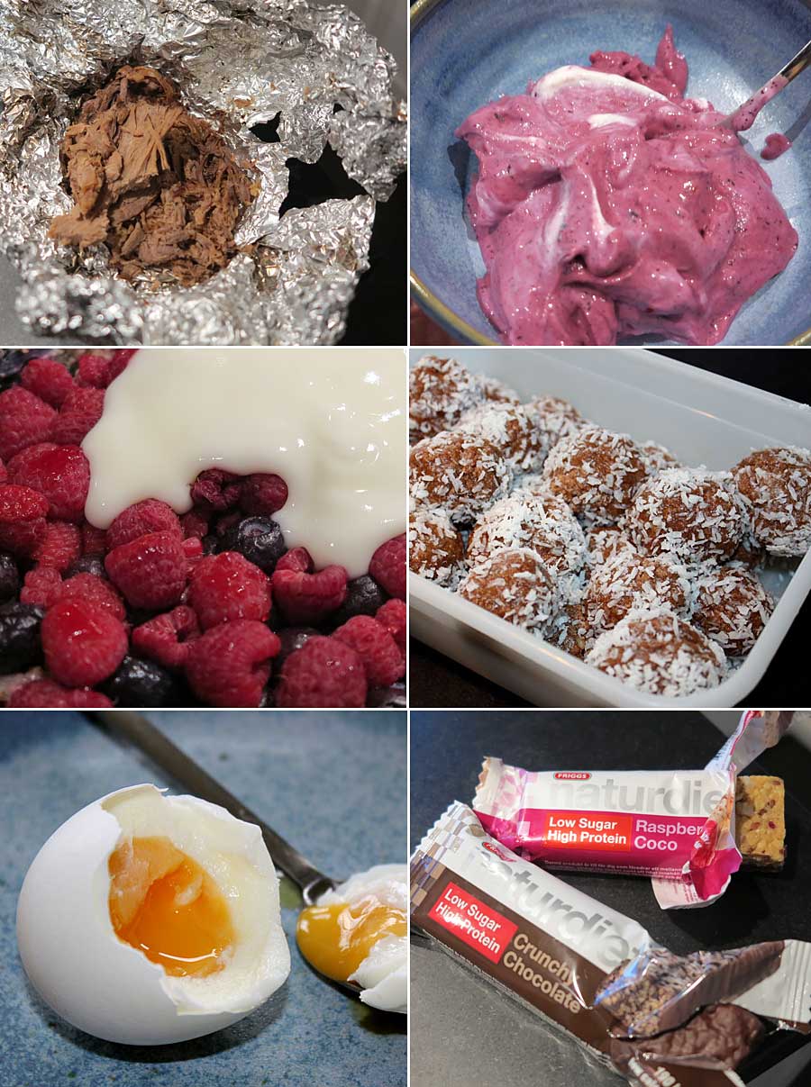 - Proteinbollar – bra fett, hög proteinhalt, GODA. Går att ha färdiga i frysen.