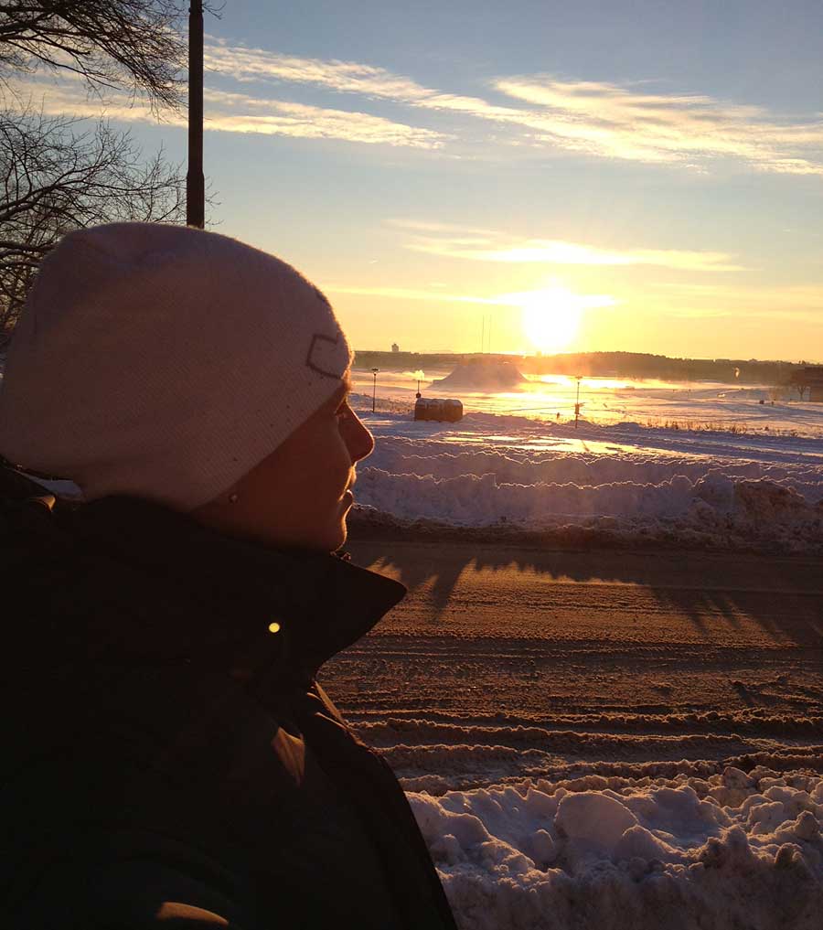 Dagen i sig. Fantastiskt vacker morgon med minusgrader och en kämpande sol bakom Gärdet. Ibland gör det inget att det är 15 minuters väntetid på bussen så att jag och barnen fick gå några stationer på väg till gymmet.