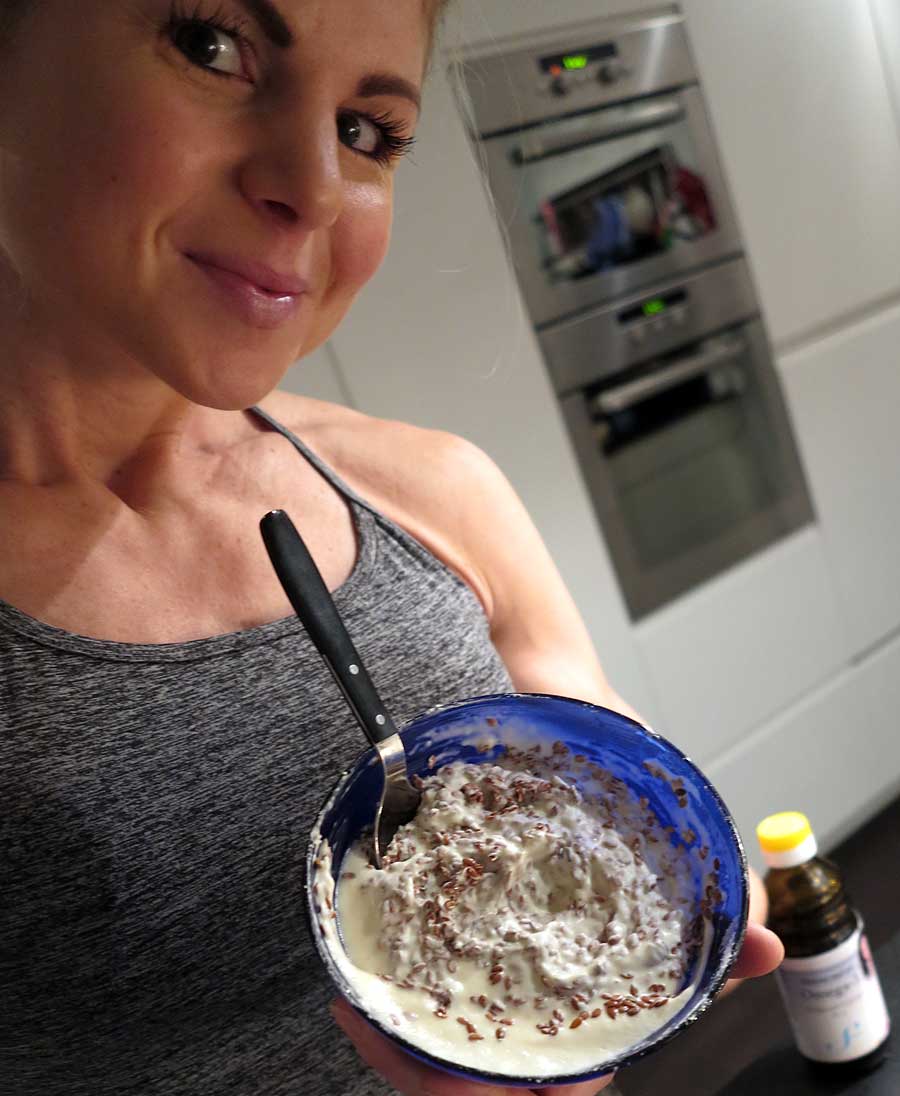 Alltså nästan EXAKT samma smak som glassen Päronsplitt! Skrev tidigare att det liknade Piggelin men ändrar mig p.g.a. vaniljsmaken. Min häxblandning med Holistics Sherins Val Päron (ej i butik än) + Gourmet-Pro Vanilla Cream + lite linfrön (för att få igång magen) – så gott att jag blir som barn på nytt. Till detta kaffe (för lite vuxen touch) och en hutt Sherins Omega-3-olja och jag är laddad för ryggträning. Ingen storfrukost direkt men den kommer senare och efter middag kl 20 är jag inte så hungrig direkt på morgonen.