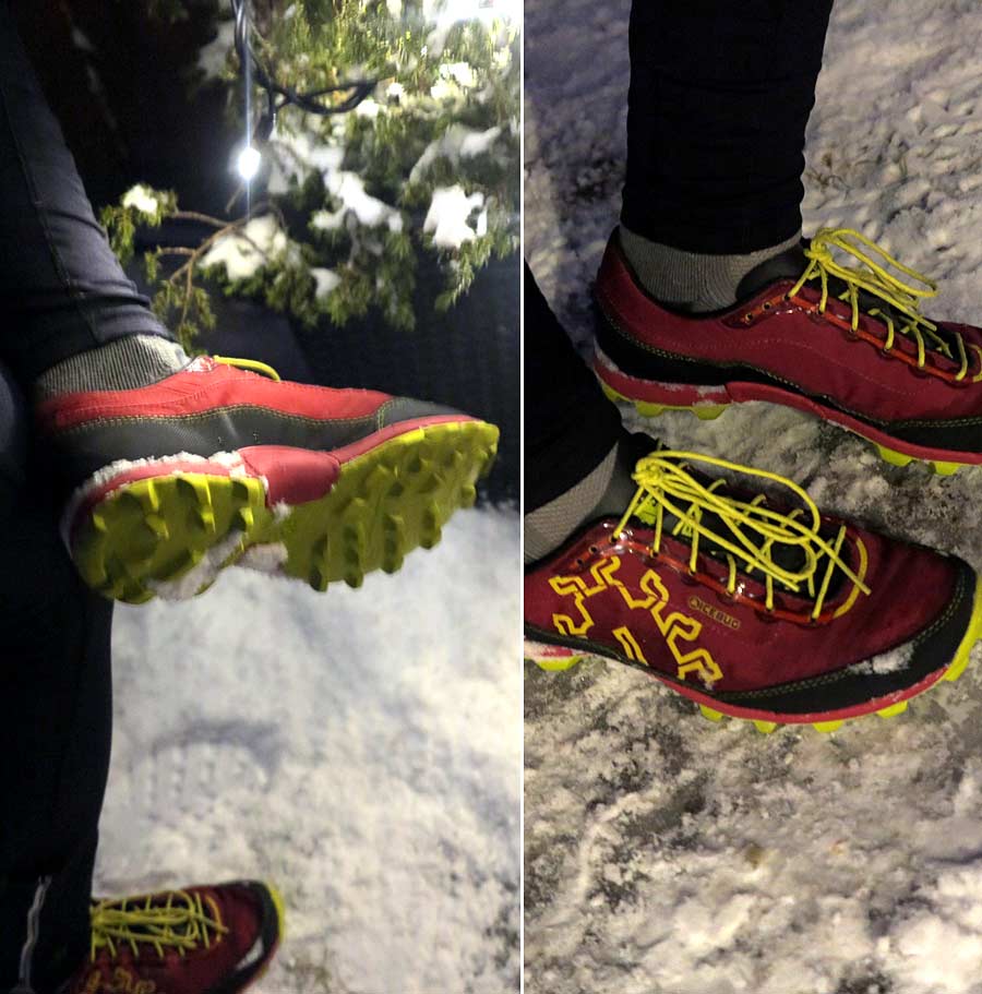 Skorna är otroligt lätta och sitter som gjutna på fötterna, men sulan är odämpade vilket ger samma känsla som barfotalöpning. Låren och framför allt vaderna får jobba väldigt mycket mer, men så himla skönt att kunna springa på utan att spänna sig i rädsla att halka. Värt lite stela vader.